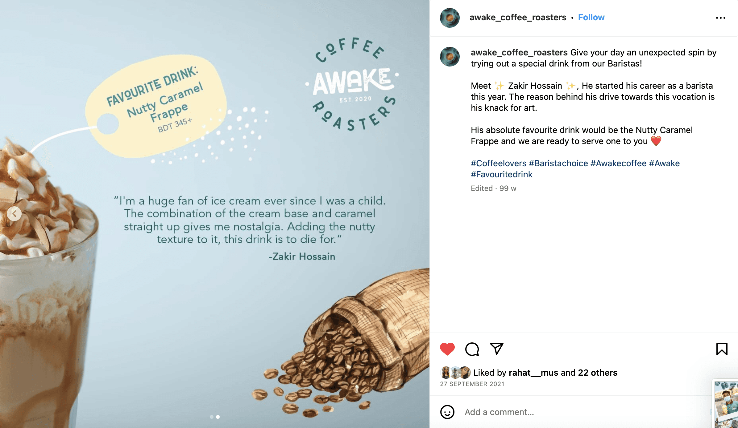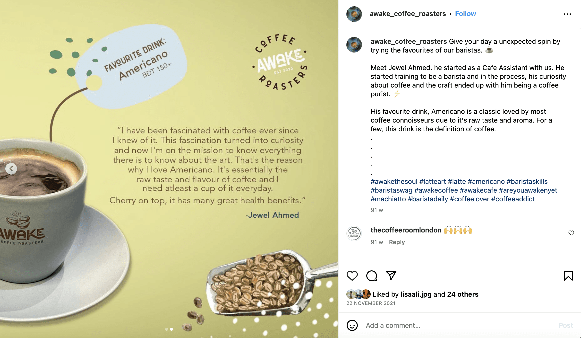 Awake Coffee Roasters is one of the only four coffee roasters in Bangladesh, making it one of the major players in the Cafe and Beans scene. After starting in 2022, they have since opened six locations and also operate an academy to train baristas.